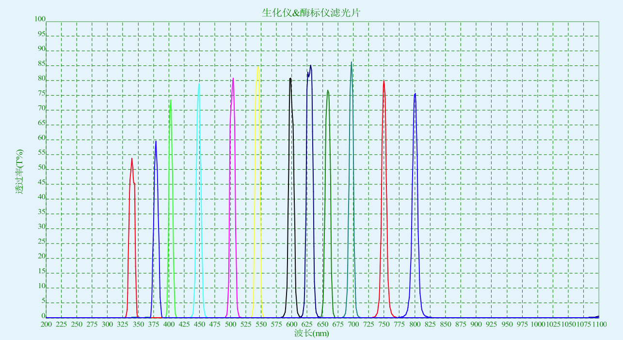 醫(yī)療儀器濾光片指應(yīng)用于酶標(biāo)儀的340nm 405nm 450nm 510nm?546nm 578nm 630nm 670nm 700nm等半帶寬19nm窄帶濾光片組和45度分光鏡。